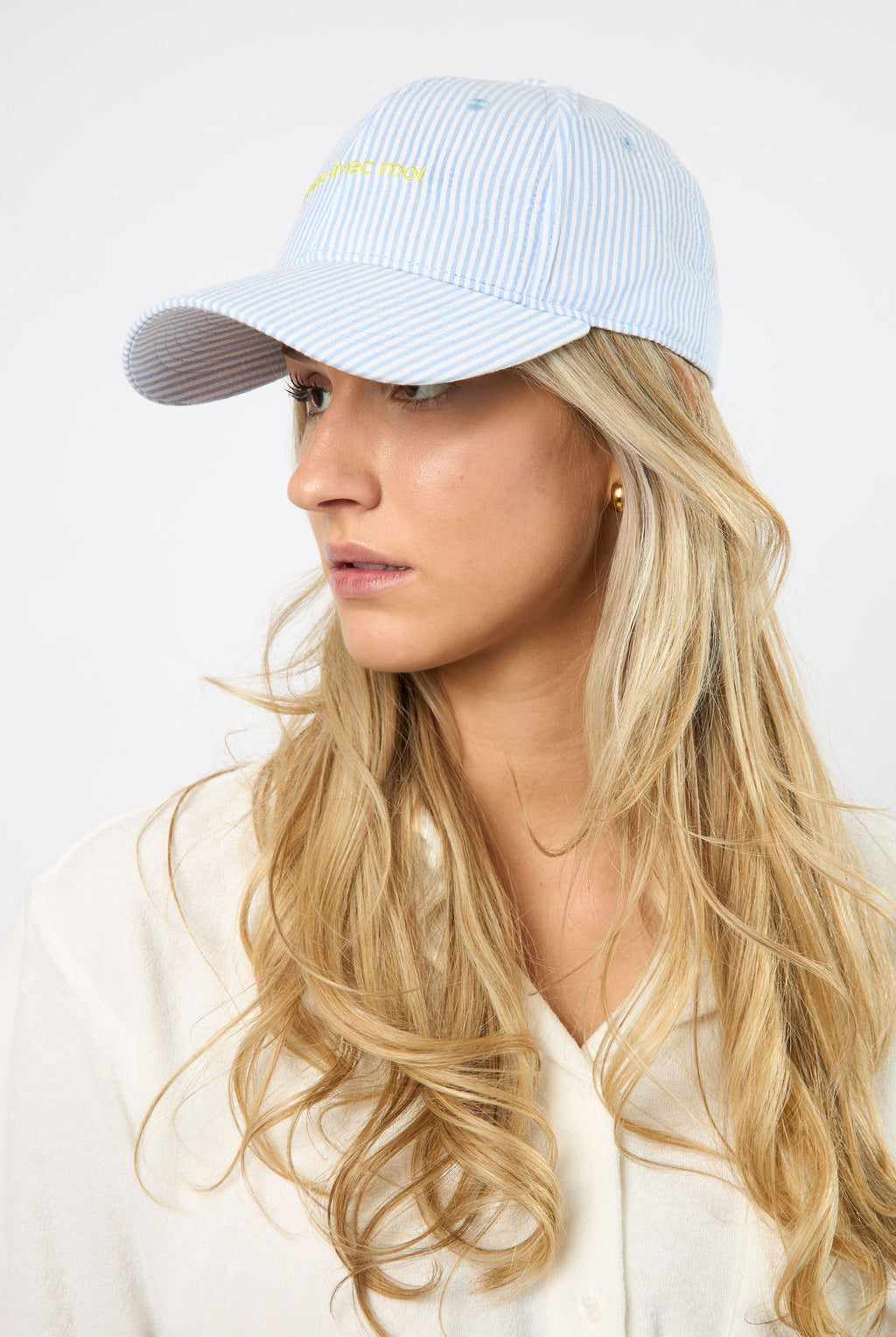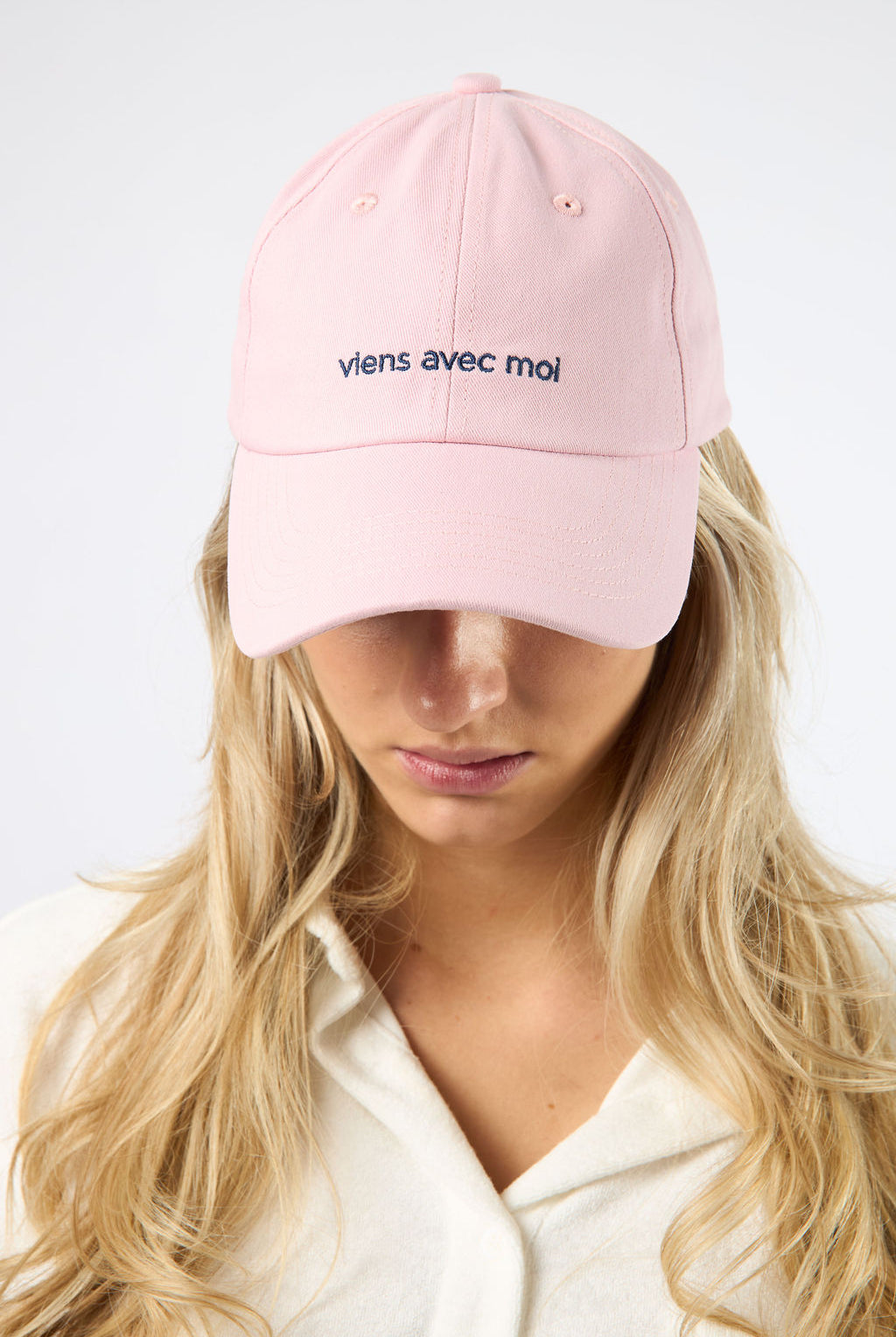 Introducing The Everyday Hat from viens avec moi. This easygoing baseball hat is the perfect accessory for any outfit. Featuring soft pastel hues and a complimentary two-toned viens avec moi signature design, it's a versatile addition to your capsule wardrobe. Effortlessly chic when paired with one of our matching sets.
