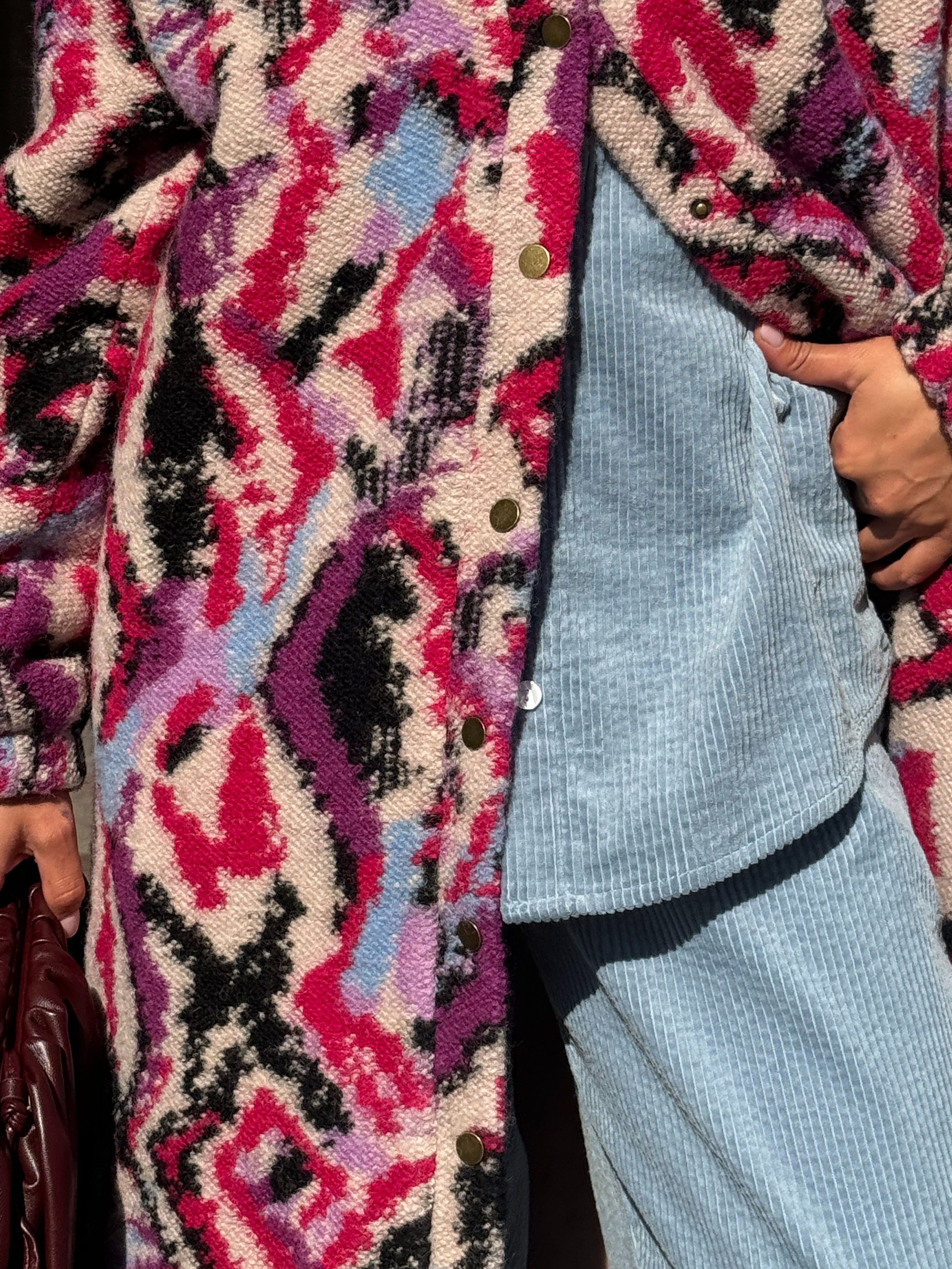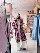 Stay cozy and chic in The Aurora Funnel Neck Coat Pink. This wool coat features snap buttons for easy wear, a playful bubbled hem, and a one-of-a-kind printed design that turns heads. Lined with soft cream sherpa fleece, it’s perfect for adding warmth and a touch of whimsy to your fall wardrobe.